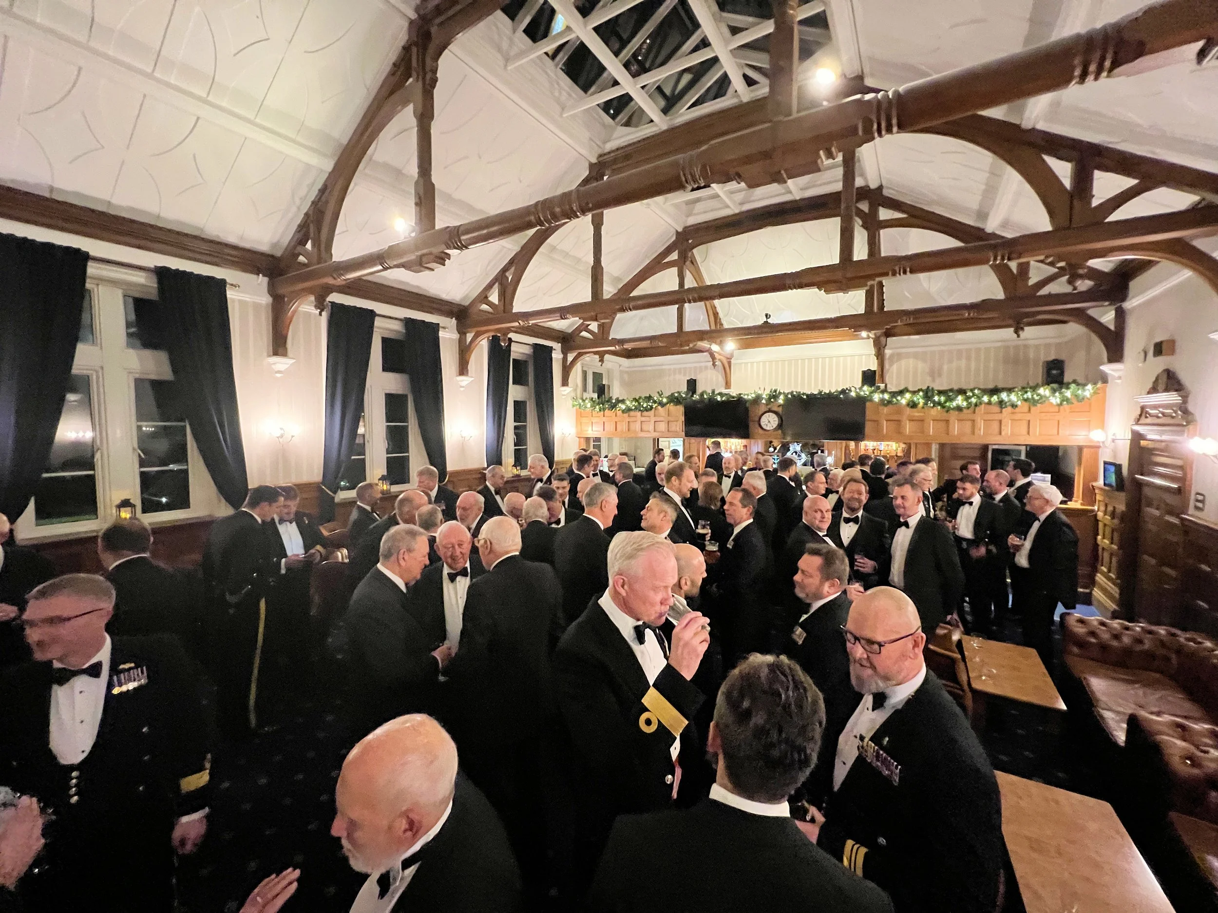 Later in the day, 89 members and their guests assembled in the wardroom at HMS EXCELLENT for the annual dinner, organised by Kev Giles, our Social Secretary. We were met with kick-starting glasses of fizz kindly sponsored by SMP (Submarine Manufacturing and Products Ltd).