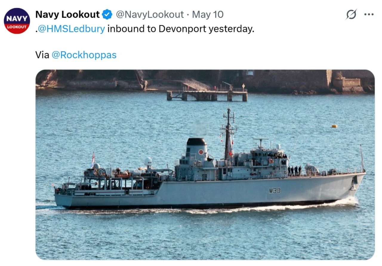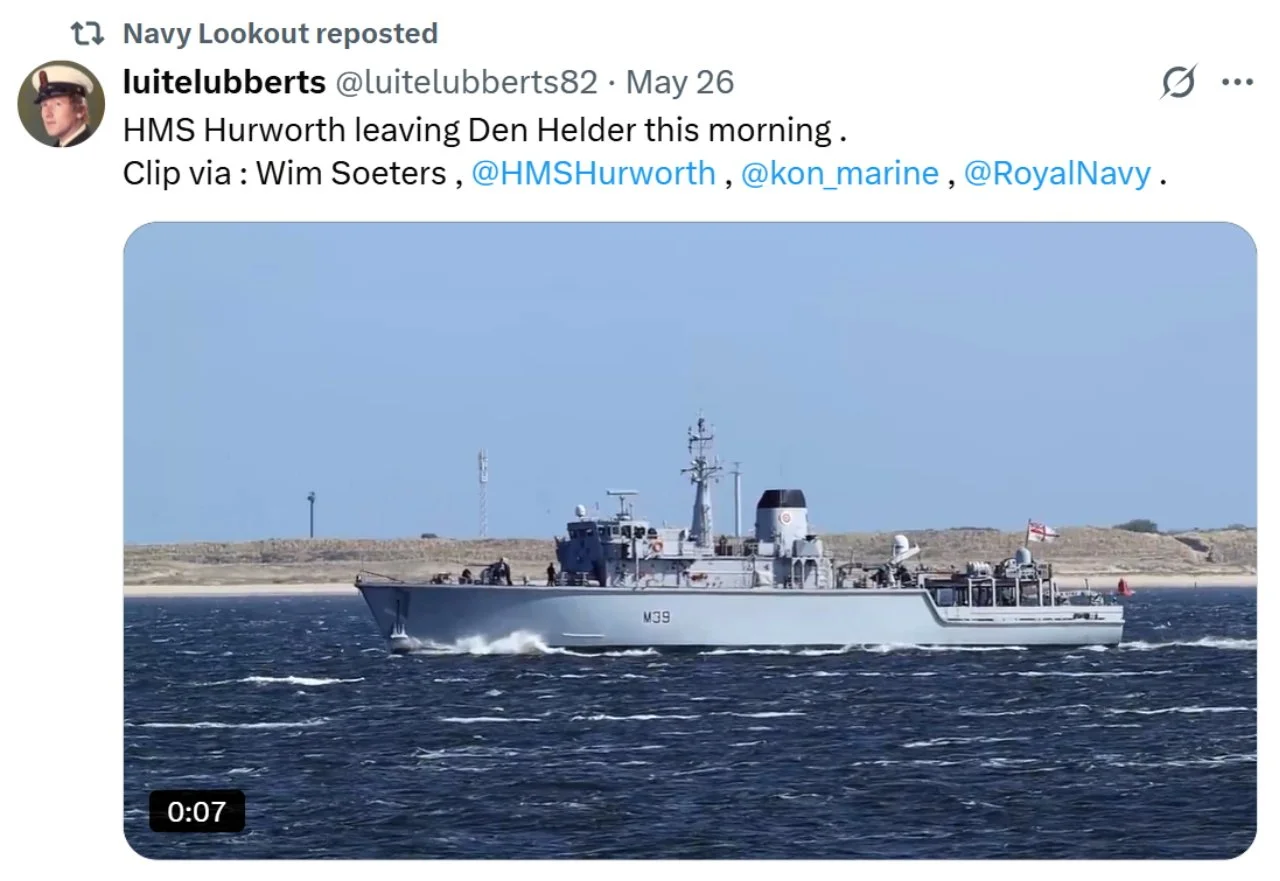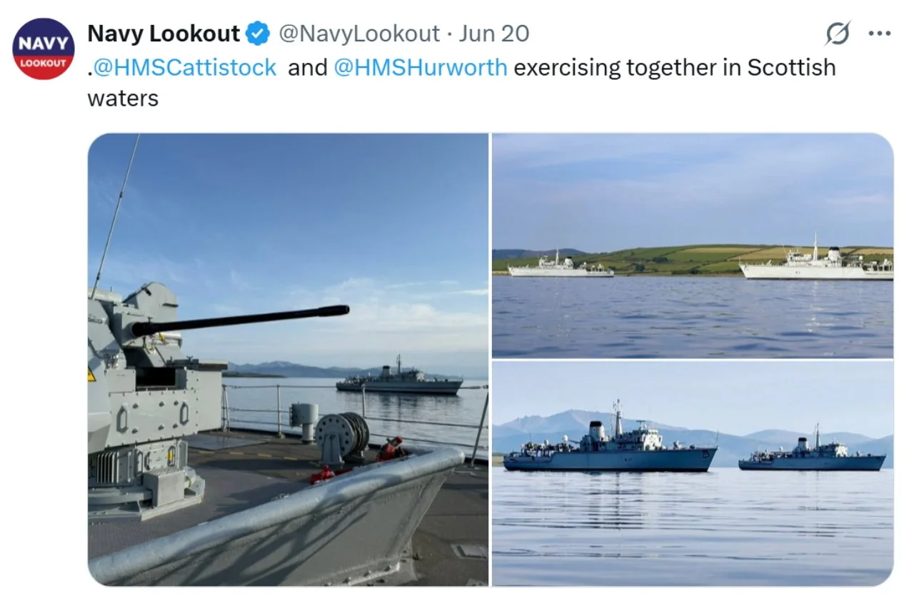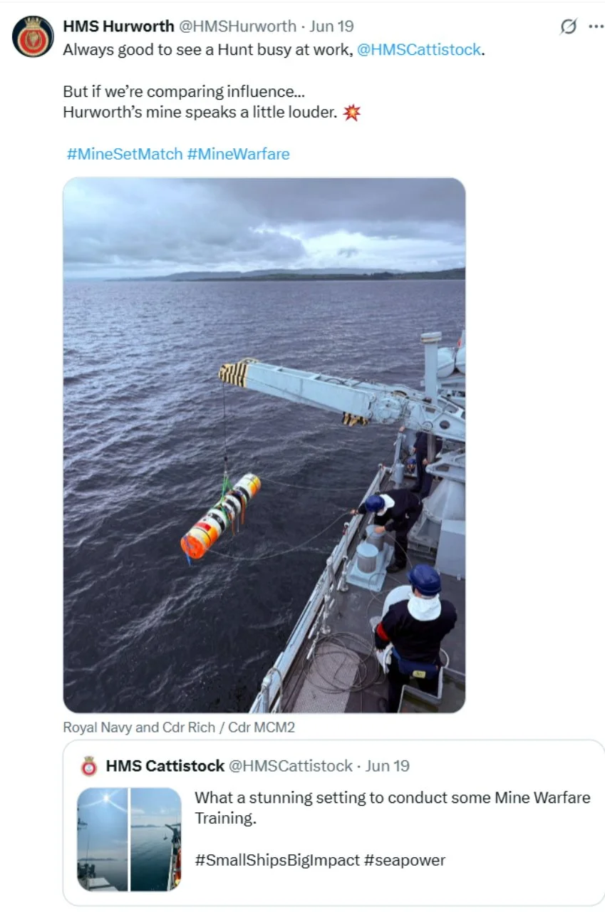 Recent ‘X’s (formerly Tweets) of interest 11 Aug Written By Rob Hoole 11 Aug 2025 - Click on the linked dates to see original ‘X’s containing videos and full-size photosFirst Sea Lord & Chief of Naval Staff5 Aug 2025 HMS CATTISTOCK (MCM2 Crew 5)12 Jul 2025 3 Jul 2025 3 Jul 2025 29 Jun 2025 19 Jun 2025 19 Jun 2025 10 Jun 2025 28 Apr 2025 27 Apr 2025 26 Apr 2025 23 Apr 2025 23 Apr 2025 HMS HURWORTH (MCM2 Crew 4)7 Aug 2025 30 Jul 2025 16 Jul 2025 11 Jul 2025 3 Jul 2025 24 Jun 2025 19 Jun 2025 19 Jun 2025 19 Jun 2025 2 Jun 2025 30 May 2025 29 May 2025 26 May 2025 23 May 2025 23 Apr 2025 23 Apr 2025 22 Apr 2025 22 Apr 2025 HMS LEDBURY (MCM2 Crew 1)7 Aug 2025 6 Aug 2025 HMS MIDDLETON (MCM2 Crew 7)6 Aug 2025 4 Aug 2025 2 Aug 2025 31 Jul 2025 30 Jul 2025 29 Jul 2025 28 Jul 2025 25 Jul 2025 24 Jul 2025 23 Jul 2025 22 Jul 2025 21 Jul 2025 16 Jul 2025 16 Jul 2025 15 Jul 2025 14 Jul 2025 13 Jul 2025 10 Jul 2025 9 Jul 2025 8 Jul 2025 9 Jun 2025 8 Jun 2025 5 Jun 2025 4 Jun 2025 28 May 2025 26 May 2025 23 May 2025 14 May 2025 MTXG (Mine & Threat Exploitation Group)7 Aug 2025 30 Jul 2025 18 Jun 2025 11 Jun 2025 14 May 2025 13 May 2025 29 Apr 2025 Navy Lookout7 Aug 2025 5 Aug 2025 17 Jul 2025 17 Jul 2025 16 Jul 2025 15 Jul 2025 12 Jul 2025 11 Jul 2025 8 Jul 2025 4 Jul 2025 3 Jul 2025 23 Jun 2025 20 Jun 2025 14 Jun 2025 12 Jun 2025 12 Jun 2025 2 Jun 2025 31 May 2025 30 May 2025 30 May 2025 26 May 2025 23 May 2025 14 May 2025 13 May 2025 10 May 2025 6 May 2025 29 Apr 2025 Rob Hoole
