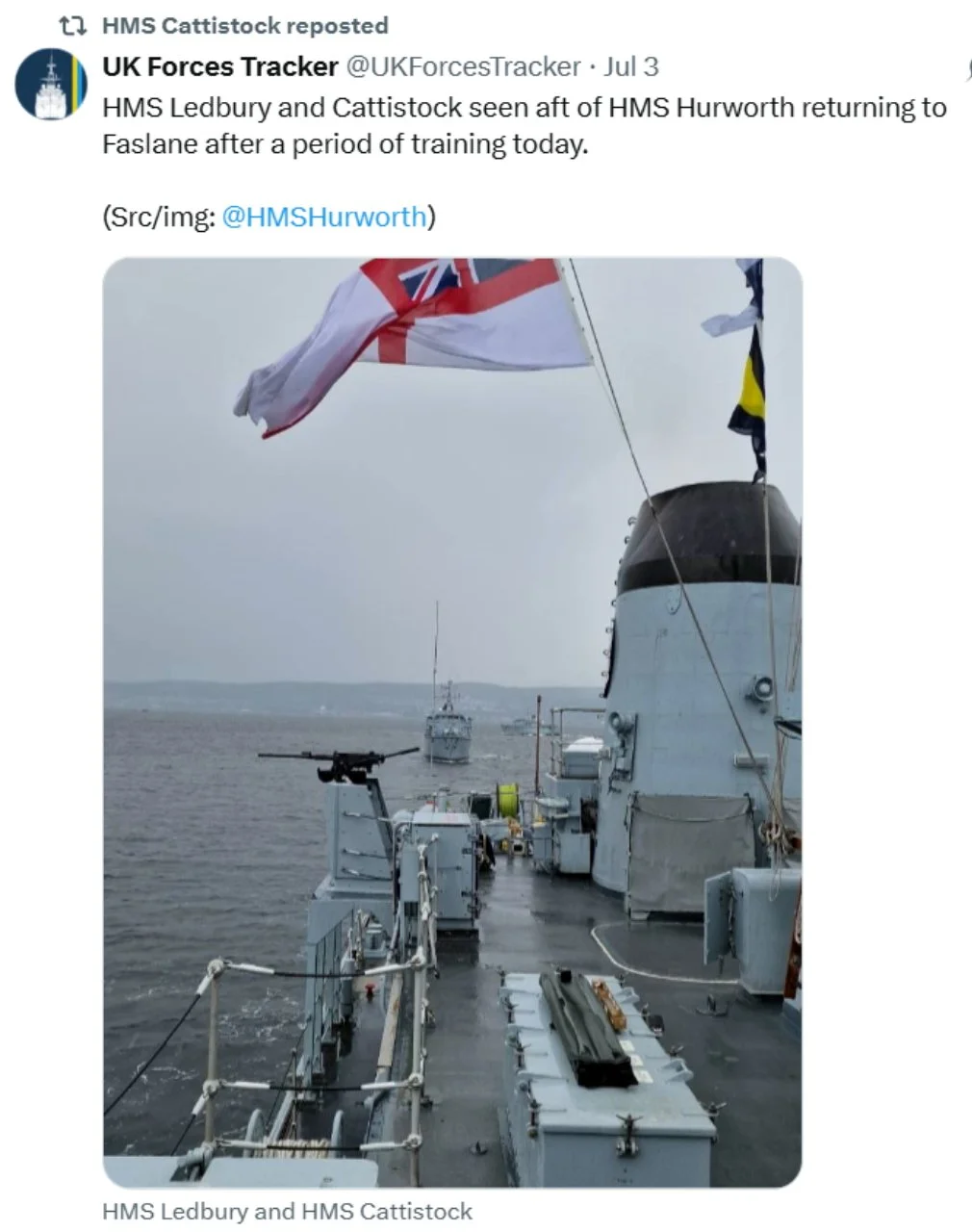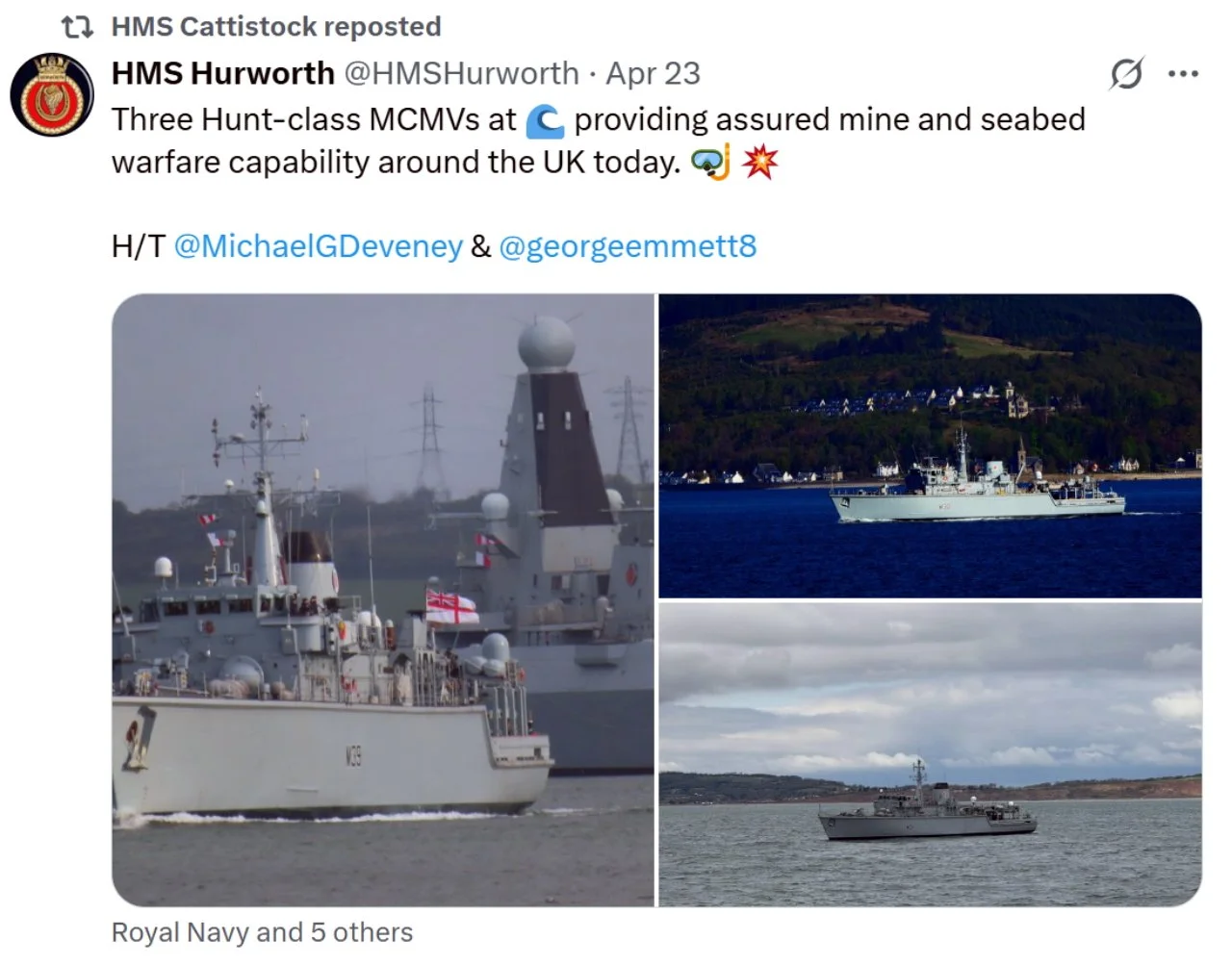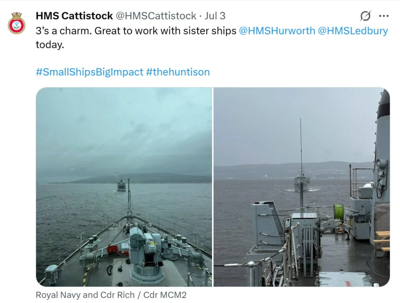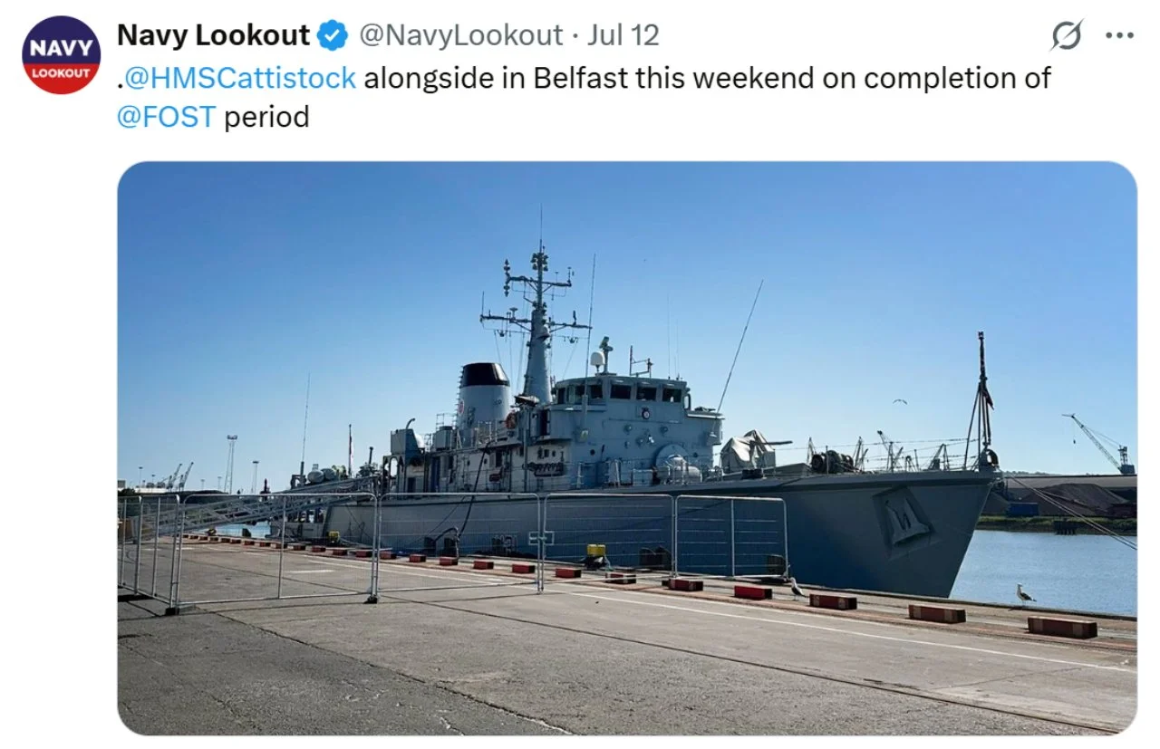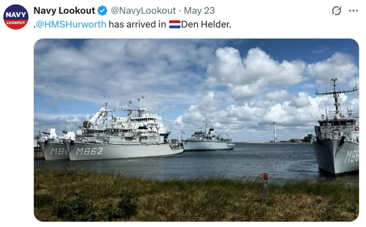 Recent ‘X’s (formerly Tweets) of interest 11 Aug Written By Rob Hoole 11 Aug 2025 - Click on the linked dates to see original ‘X’s containing videos and full-size photosFirst Sea Lord & Chief of Naval Staff5 Aug 2025 HMS CATTISTOCK (MCM2 Crew 5)12 Jul 2025 3 Jul 2025 3 Jul 2025 29 Jun 2025 19 Jun 2025 19 Jun 2025 10 Jun 2025 28 Apr 2025 27 Apr 2025 26 Apr 2025 23 Apr 2025 23 Apr 2025 HMS HURWORTH (MCM2 Crew 4)7 Aug 2025 30 Jul 2025 16 Jul 2025 11 Jul 2025 3 Jul 2025 24 Jun 2025 19 Jun 2025 19 Jun 2025 19 Jun 2025 2 Jun 2025 30 May 2025 29 May 2025 26 May 2025 23 May 2025 23 Apr 2025 23 Apr 2025 22 Apr 2025 22 Apr 2025 HMS LEDBURY (MCM2 Crew 1)7 Aug 2025 6 Aug 2025 HMS MIDDLETON (MCM2 Crew 7)6 Aug 2025 4 Aug 2025 2 Aug 2025 31 Jul 2025 30 Jul 2025 29 Jul 2025 28 Jul 2025 25 Jul 2025 24 Jul 2025 23 Jul 2025 22 Jul 2025 21 Jul 2025 16 Jul 2025 16 Jul 2025 15 Jul 2025 14 Jul 2025 13 Jul 2025 10 Jul 2025 9 Jul 2025 8 Jul 2025 9 Jun 2025 8 Jun 2025 5 Jun 2025 4 Jun 2025 28 May 2025 26 May 2025 23 May 2025 14 May 2025 MTXG (Mine & Threat Exploitation Group)7 Aug 2025 30 Jul 2025 18 Jun 2025 11 Jun 2025 14 May 2025 13 May 2025 29 Apr 2025 Navy Lookout7 Aug 2025 5 Aug 2025 17 Jul 2025 17 Jul 2025 16 Jul 2025 15 Jul 2025 12 Jul 2025 11 Jul 2025 8 Jul 2025 4 Jul 2025 3 Jul 2025 23 Jun 2025 20 Jun 2025 14 Jun 2025 12 Jun 2025 12 Jun 2025 2 Jun 2025 31 May 2025 30 May 2025 30 May 2025 26 May 2025 23 May 2025 14 May 2025 13 May 2025 10 May 2025 6 May 2025 29 Apr 2025 Rob Hoole