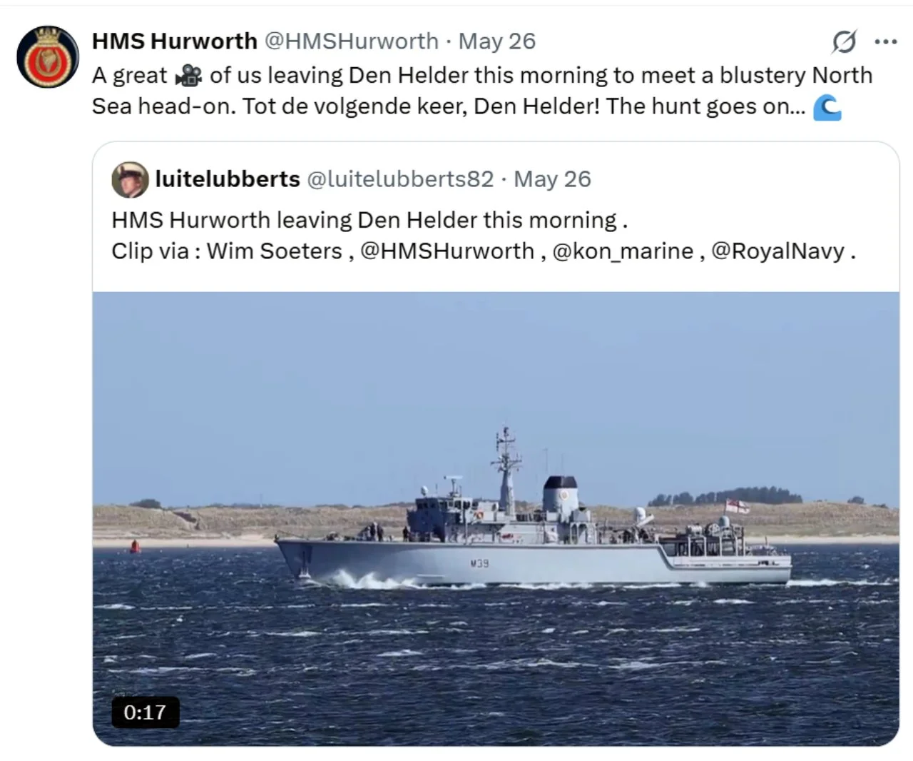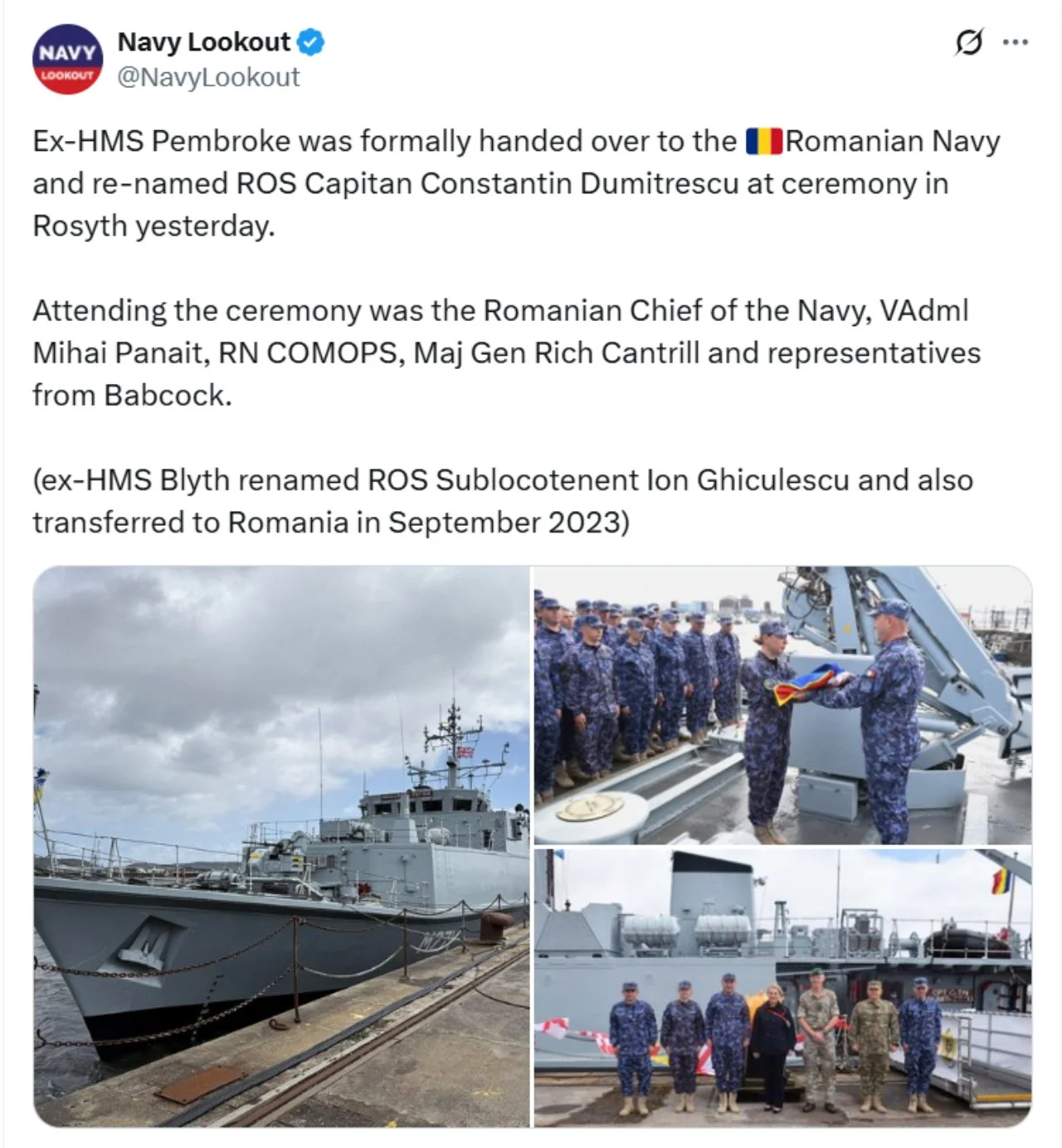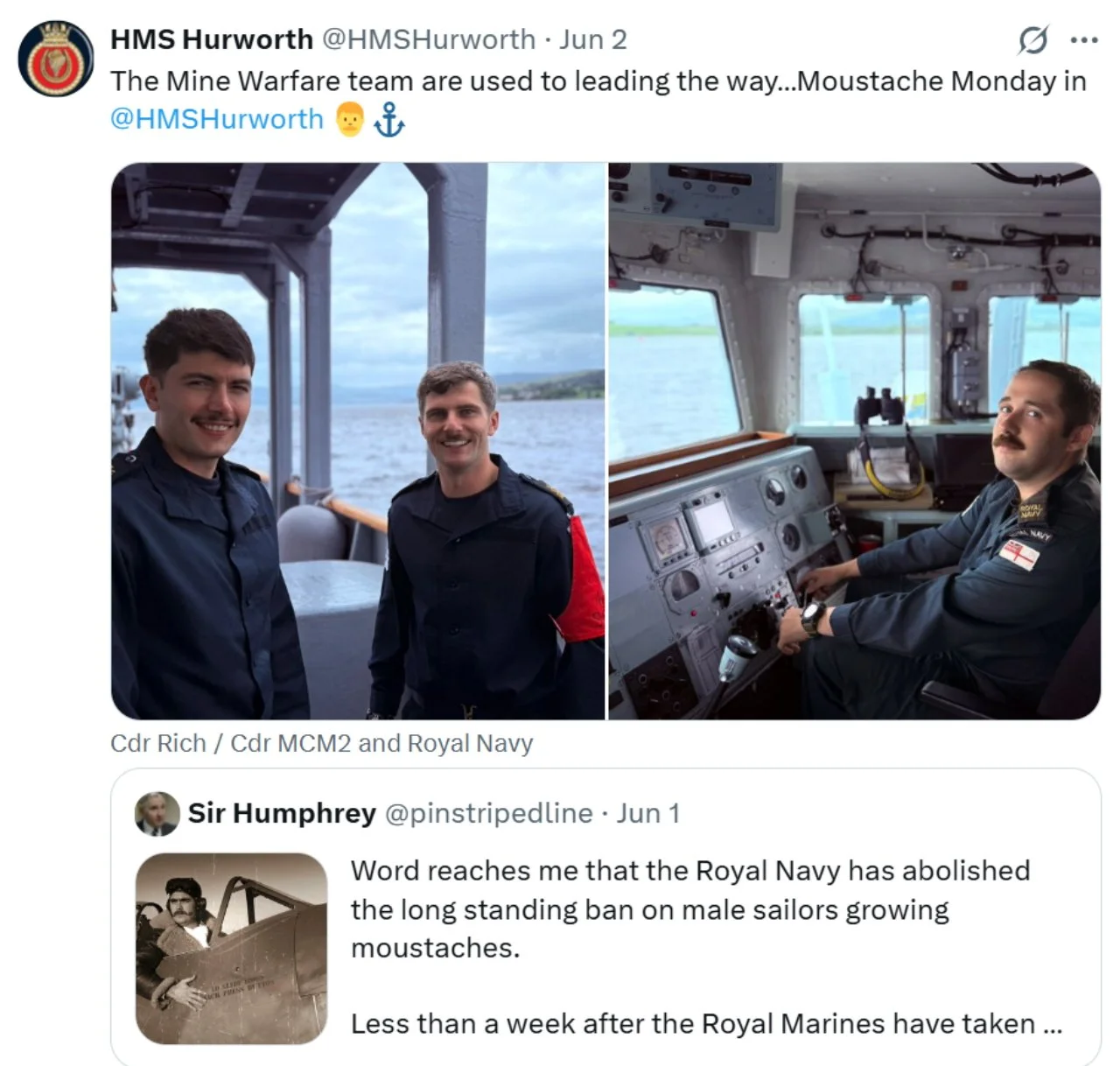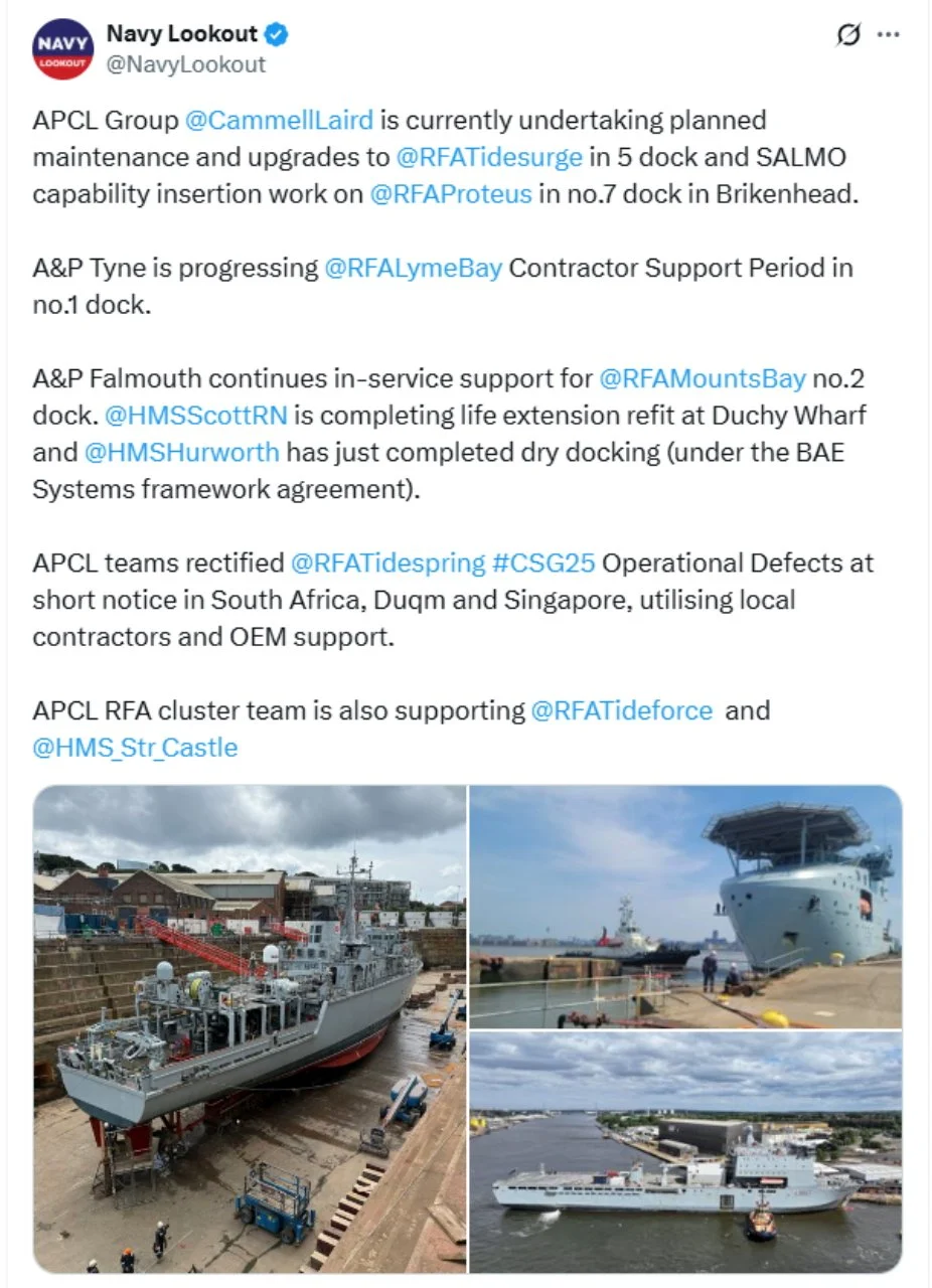 Recent ‘X’s (formerly Tweets) of interest 11 Aug Written By Rob Hoole 11 Aug 2025 - Click on the linked dates to see original ‘X’s containing videos and full-size photosFirst Sea Lord & Chief of Naval Staff5 Aug 2025 HMS CATTISTOCK (MCM2 Crew 5)12 Jul 2025 3 Jul 2025 3 Jul 2025 29 Jun 2025 19 Jun 2025 19 Jun 2025 10 Jun 2025 28 Apr 2025 27 Apr 2025 26 Apr 2025 23 Apr 2025 23 Apr 2025 HMS HURWORTH (MCM2 Crew 4)7 Aug 2025 30 Jul 2025 16 Jul 2025 11 Jul 2025 3 Jul 2025 24 Jun 2025 19 Jun 2025 19 Jun 2025 19 Jun 2025 2 Jun 2025 30 May 2025 29 May 2025 26 May 2025 23 May 2025 23 Apr 2025 23 Apr 2025 22 Apr 2025 22 Apr 2025 HMS LEDBURY (MCM2 Crew 1)7 Aug 2025 6 Aug 2025 HMS MIDDLETON (MCM2 Crew 7)6 Aug 2025 4 Aug 2025 2 Aug 2025 31 Jul 2025 30 Jul 2025 29 Jul 2025 28 Jul 2025 25 Jul 2025 24 Jul 2025 23 Jul 2025 22 Jul 2025 21 Jul 2025 16 Jul 2025 16 Jul 2025 15 Jul 2025 14 Jul 2025 13 Jul 2025 10 Jul 2025 9 Jul 2025 8 Jul 2025 9 Jun 2025 8 Jun 2025 5 Jun 2025 4 Jun 2025 28 May 2025 26 May 2025 23 May 2025 14 May 2025 MTXG (Mine & Threat Exploitation Group)7 Aug 2025 30 Jul 2025 18 Jun 2025 11 Jun 2025 14 May 2025 13 May 2025 29 Apr 2025 Navy Lookout7 Aug 2025 5 Aug 2025 17 Jul 2025 17 Jul 2025 16 Jul 2025 15 Jul 2025 12 Jul 2025 11 Jul 2025 8 Jul 2025 4 Jul 2025 3 Jul 2025 23 Jun 2025 20 Jun 2025 14 Jun 2025 12 Jun 2025 12 Jun 2025 2 Jun 2025 31 May 2025 30 May 2025 30 May 2025 26 May 2025 23 May 2025 14 May 2025 13 May 2025 10 May 2025 6 May 2025 29 Apr 2025 Rob Hoole